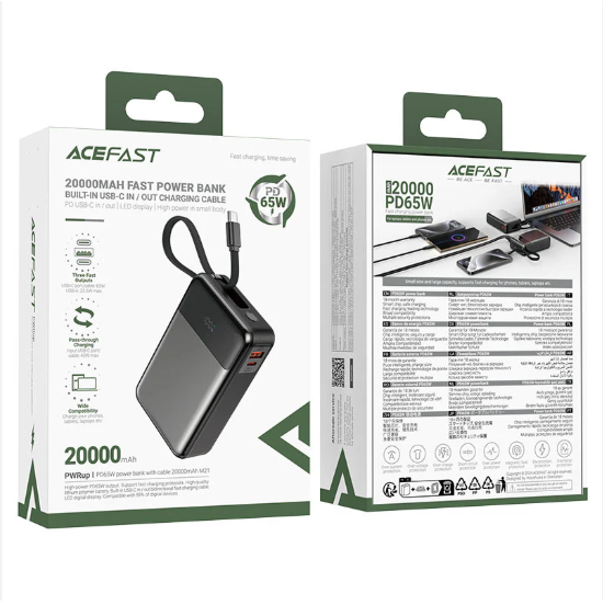 - The Acefast M21 20,000mAh 65W Power Bank is a high-performance portable charger designed to keep your devices powered anytime, anywhere. With a massive 20,000mAh capacity and a rated 12,000mAh output, this power bank ensures multiple full charges for smartphones, tablets, laptops, and other electronic devices. Its built-in Type-C cable supports bidirectional fast charging up to 65W, delivering rapid and reliable power whenever you need it.