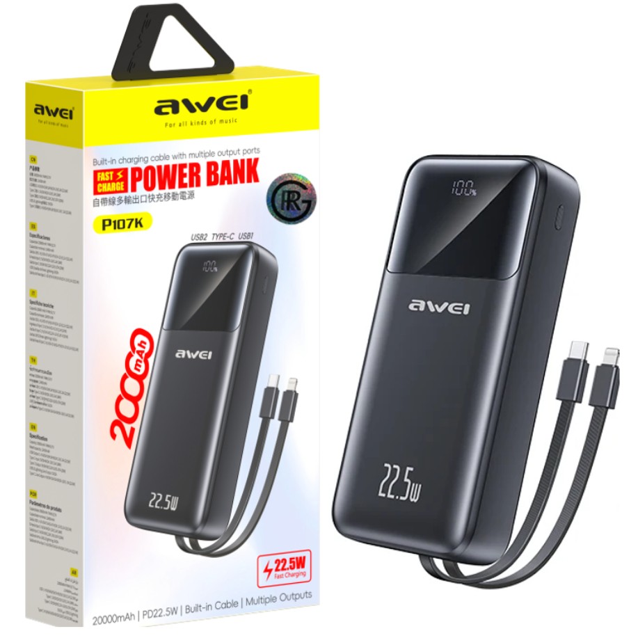- The Awei P107K 20000mAh 22.5W Fast Charging Digital Display Power Bank is an excellent companion for those constantly on the move. With its large 20000mAh capacity, it provides plenty of power to keep your devices charged throughout the day. Moreover, its high-speed charging capability, with a maximum output of 22.5W, ensures that your devices will charge efficiently. Whether you need to power up your phone, tablet, or other gadgets, this power bank offers reliable performance.