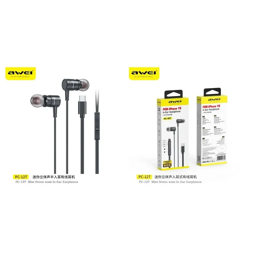Experience seamless audio with the Awei PC-12T USB-C Wired Earphone. This device is designed for users who want high-quality audio with modern connectivity. With its Type-C plug, it ensures seamless compatibility with the latest devices, including the iPhone 15. The 10mm driver unit delivers clear and immersive sound while the ergonomic design ensures a comfortable fit for extended listening. Whether you're enjoying music, taking calls, or watching videos, this earphone offers a balanced audio experience with deep bass and crisp highs.