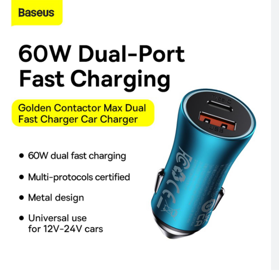 Baseus Golden Contactor Max Dual Fast Charger Car Charger U+C 60W Dark Gray
