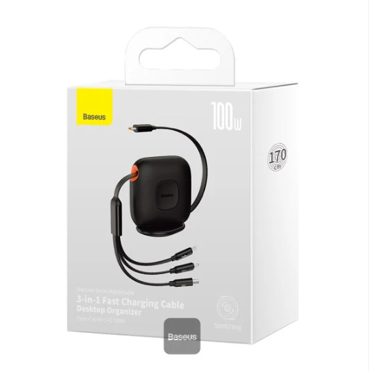 Baseus Cable 100W Cable Type-C to Micro Type-C Lightning Traction Series Retractable 3-in-1 Fast Charging Cable 1.7m Black