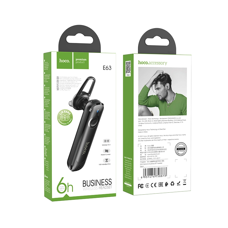 E63 Diamond, wireless headset, BT v5.0, 70mAh for 6 hours of calls and music, 180 hours of standby