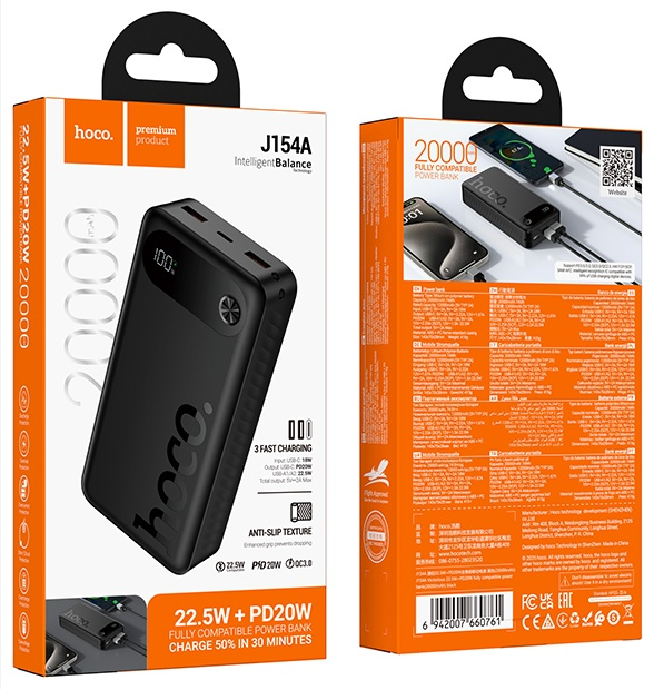 - The Hoco J154A 22.5W PowerBank is a powerful and reliable portable charger designed to keep all your devices powered up wherever you go. With its massive 20000mAh capacity, this power bank can deliver multiple full charges for smartphones, tablets, laptops, and other USB-powered gadgets. Whether you are traveling, working, or enjoying outdoor adventures, the Hoco J154A ensures you stay connected without worrying about running out of battery.