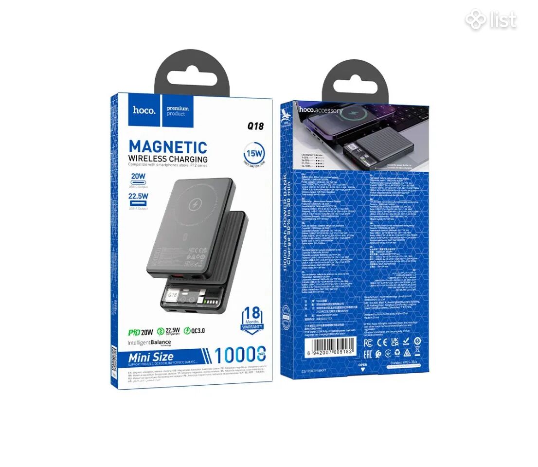 The Hoco Q18 is a 10000mAh power bank with 22.5W wired and 15W magnetic wireless charging. It has a Type-C input and output, and a USB-A output. It also has an LED display that shows the remaining battery level.