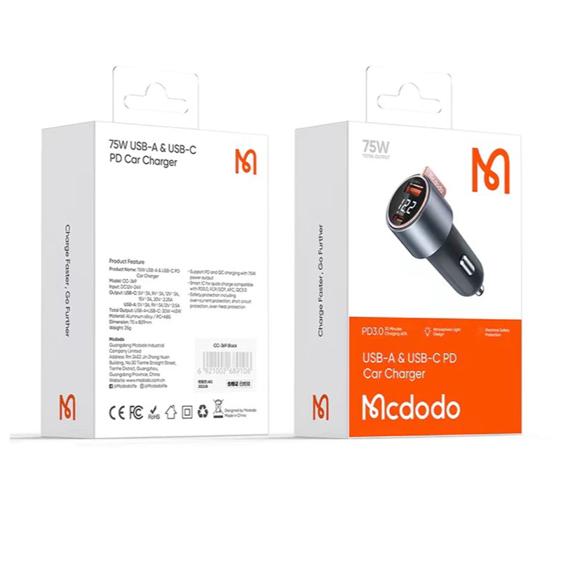 - Introducing the Mcdodo 75W USB-C Digital Display Car Charger – your versatile charging solution for on-the-go convenience. It accommodates iPhones, MacBooks, Samsung devices, and more. The sleek aluminum alloy and PC ABS construction ensure durability while enhancing style, making it an ideal fit for any car interior.