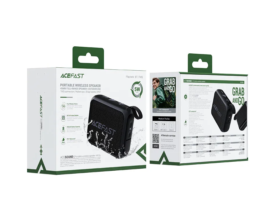 - The ACEFAST K4 Go is a compact yet powerful portable wireless speaker designed for music lovers who demand excellent sound quality in a lightweight form. With a 5W power output, it delivers impressive audio performance with rich bass and clear vocals, making it perfect for both indoor and outdoor use. Whether at home, hiking, camping, or working in the office, this mini speaker ensures an immersive sound experience.
