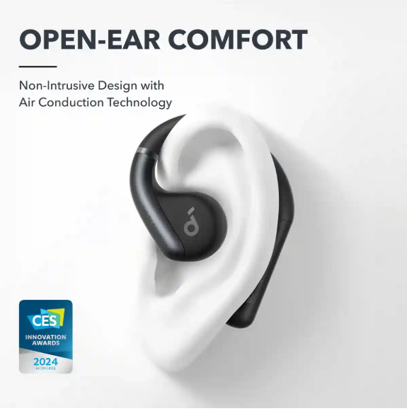 Introducing the Anker Soundcore AeroFit Open-Ear Bluetooth Earbuds, a revolutionary audio accessory that redefines comfort, awareness, and sound quality. Designed with unmatched comfort in mind, the AeroFit headphones boast a lightweight and compact design optimized for small ears. This thoughtful engineering ensures a breathable listening experience, allowing users to enjoy extended wear without discomfort. As you wear them, the AeroFit gradually conforms to your ears, providing greater comfort over time.