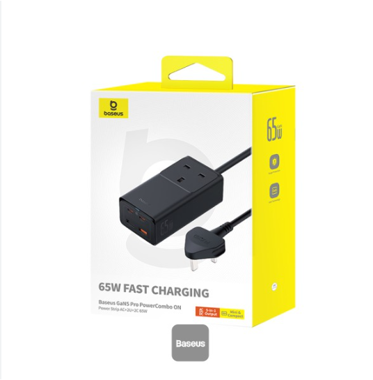[GaN Tech] Baseus 65W GaN3 Pro USB-C Charger Desktop Power Strip With AC Socket Port / 2*USB-C /USB QC3.0 / USB-A Fast Charging Wall Charger Adapter CN/AU Plug With 100W USB-C to USB-C Cable – Black