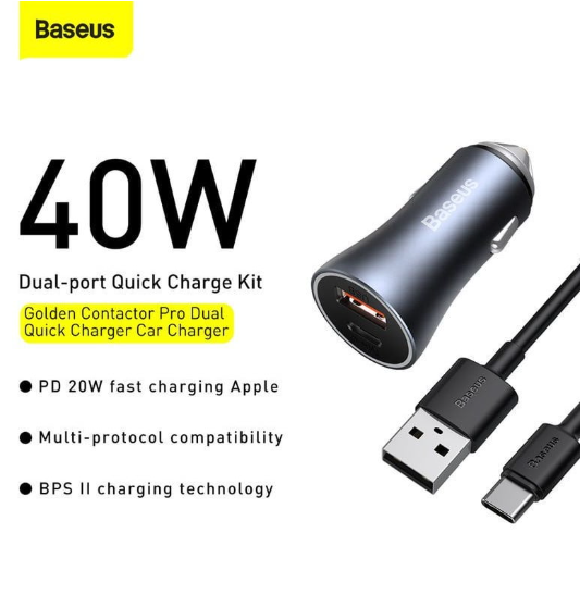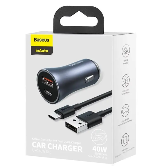 Baseus Golden Contactor Pro Dual Quick Charger Car Charger U+C 40W USB Type-C 5A 1.0m Cable Dark Gray TZCCJD-0G