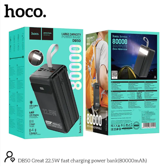 - The Hoco DB50 PowerBank 80000mAh 22.5w is one of the most powerful and versatile portable chargers available today. With its massive capacity, fast charging support, and multiple ports, it is designed to keep all your devices powered up during travel, outdoor adventures, or emergencies. Whether you need to charge smartphones, tablets, laptops, or other gadgets, this power bank ensures reliable performance anywhere, anytime.