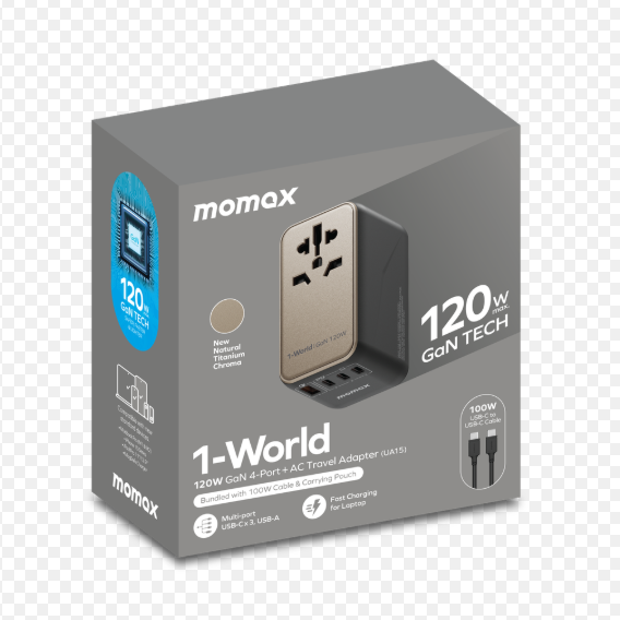 Momax 1-World 120W GaN Universal 4-Ports Travel Charger with 100W USB-C to USB-C Cable